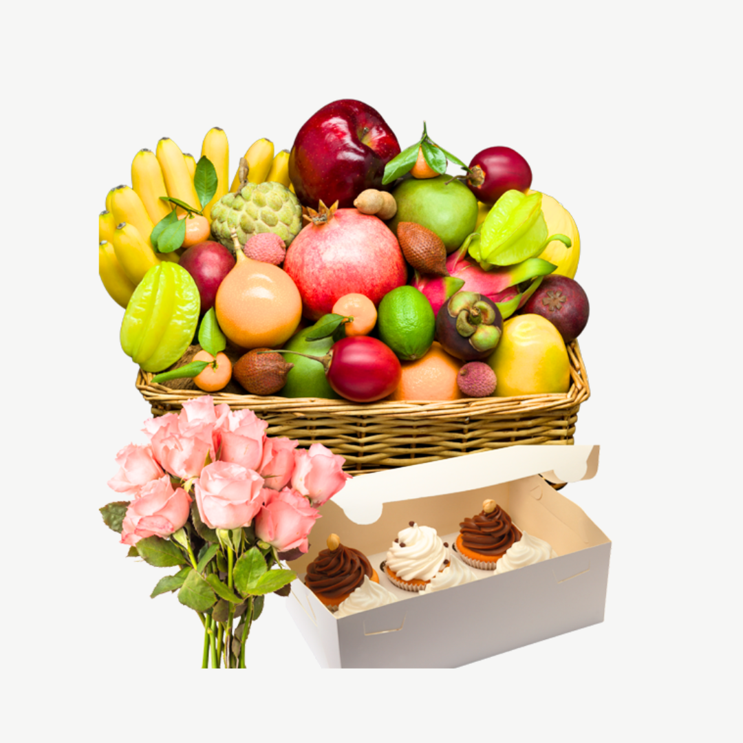A Delightful Trio – Fruits, Flowers & Cupcake Box.